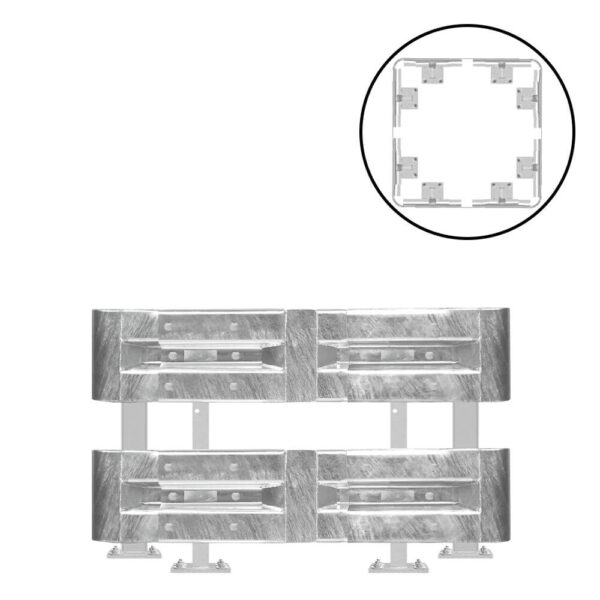 4-seitiger Säulenschutz-Komplett-Bausatz M75-2SP, aus Stahl-Leitplanke mit Profil B, feuerverzinkt, zum Aufschrauben. Beinhaltet alles, was Sie benötigen, um ein von den Abmaßen großes (außen 138 cm, innen 88 cm), 2-holmiges Leitplanken-System zu bauen. Die Multi-Pfosten sind 75 cm hoch. Sie haben 3 frei wählbare Plankenholm-Höhen zur Wahl. Einfachste Montage dank Farbcodierung. Details unten.