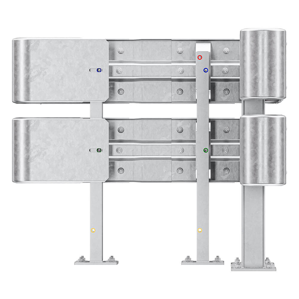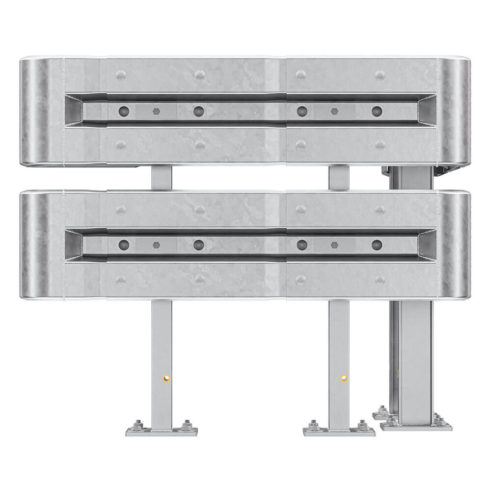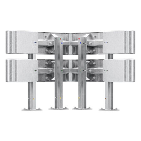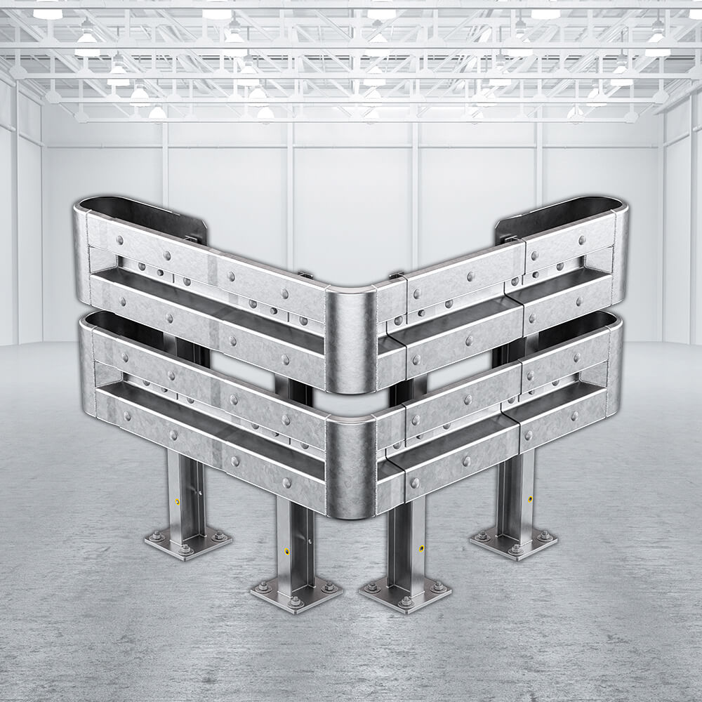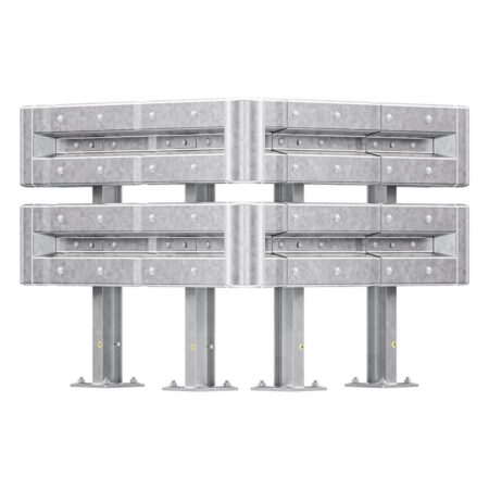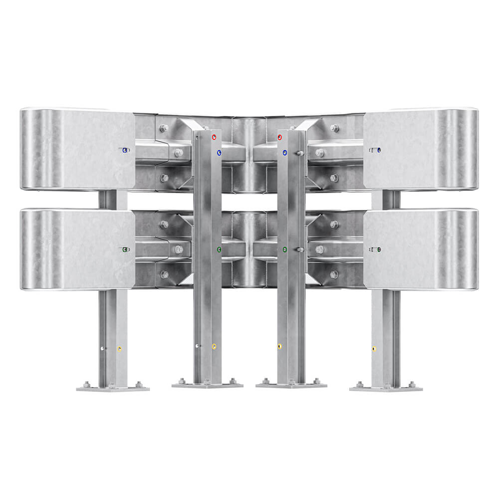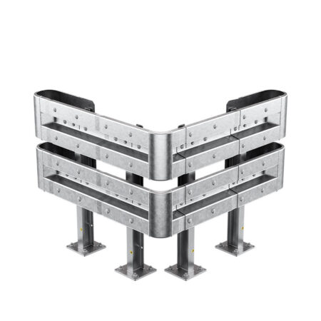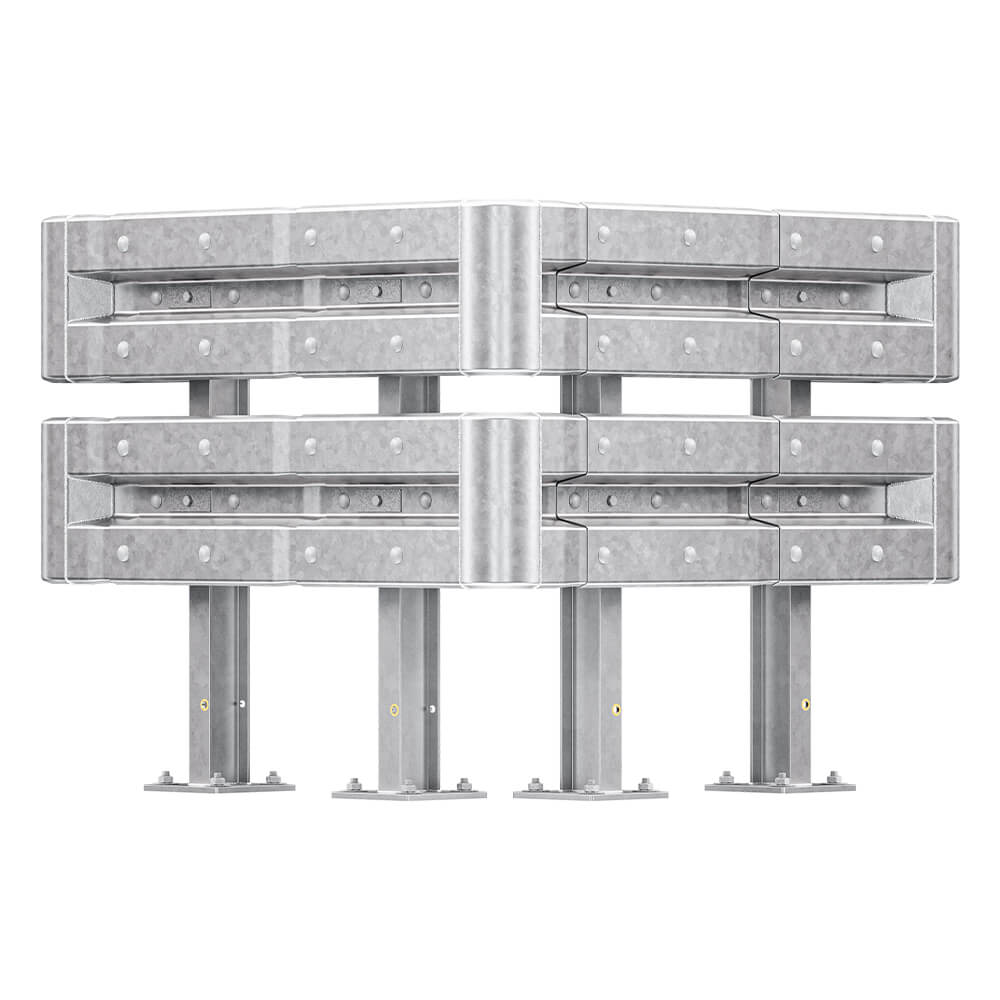 Der Außenwinkel-Komplett-Bausatz M100-2SP aus feuerverzinkten Stahl-Leitplanke mit Profil B beinhaltet alles, was Sie benötigen, um einen 2-holmigen Leitplanken-Eckschutz mit 127 cm Seitenlänge zu bauen. Die Multi-Pfosten sind 100 cm hoch. Sie haben 5 frei wählbare Plankenholm-Höhen zur Wahl. Einfachste Montage dank Farbcodierung. Details unten.
