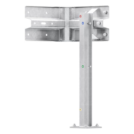 Leitplanken Verlängerungs-Bausatz Außen-Eckstück M100-1SP, aus Stahl, feuerverzinkt, zum Aufschrauben. Beinhaltet alles, was Sie benötigen, um ein 1-holmiges Außenwinkel-System zu bauen. Die Multi-Pfosten sind 100 cm hoch. Sie haben 4 frei wählbare Plankenholm-Höhen zur Wahl. Beliebig erweiterbar. Einfachste Montage dank Farbcodierung. Details unten.