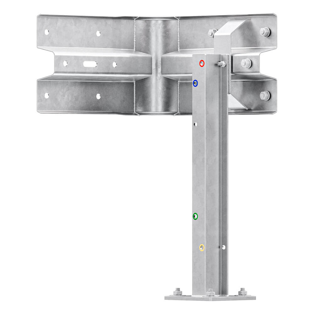 Leitplanken Verlängerungs-Bausatz Außen-Eckstück M75-1SP, aus Stahl, feuerverzinkt, zum Aufschrauben. Beinhaltet alles, was Sie benötigen, um ein 1-holmiges Außenwinkel-System zu bauen. Die Multi-Pfosten sind 75 cm hoch. Sie haben 5 frei wählbare Plankenholm-Höhen zur Wahl. Beliebig erweiterbar. Einfachste Montage dank Farbcodierung. Details unten.